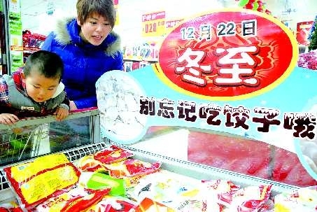 22日,在胶州路上的一家超市内,记者看到水饺专柜处挤满了前来抢购的顾客。据工作人员介绍,冬至这天水饺全都打折销售,原价15.9元/1500克,现在仅售9.5元/1500克。超市的值班经理告诉记者,今年针对冬至超市比往常多准备了一半水饺。 本报见习记者 张大宁 郑美芹 摄影报道