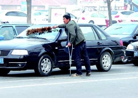 22日,东营市济南路与西二路交会处,一名男子正拄着拐杖站在车流中给过往车辆象征性地擦拭挡风玻璃,然后索要费用,不少司机会打开车窗给他一些零钱。济南路车流量大,该男子的行为给交通安全造成了一定的隐患。