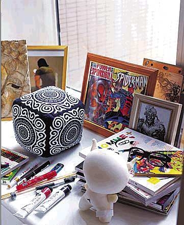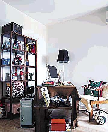 随意铺就的小羊羔皮,造成了些许西部感觉。中式印花布老虎和沙包的装饰意味很是乡土。新中式风格的座椅、NBA的靠包与白色的皮毛造成冲突效果。涂鸦式的装饰画和强调意境的摄影作品,将一个普通的飘窗营造出了HIP造HOP的感觉。限量品的玩具又配以精致的手写本,呈现出一种更高级的玩乐风范。简单却略带复古气质的的灯具同陈列柜似乎就是这里最和谐的一对,但与陈列柜一组的边桌却用细小的网格拉开了与复古这个词的距离。当这一切都混乱地出现在这个区域的时候,却发生了惊人的“化学反应”,它们成为了一体,并营造了一种特别的气质,一种独属于熠菲的气质。