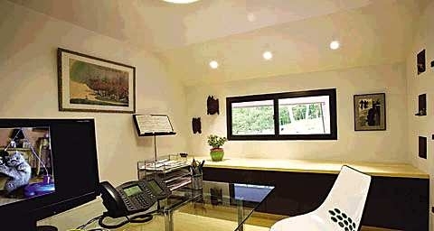 这间阁楼的男主人是一位商家,也是一位摄影师,他每天花很多时间在家中的办公室工作,所以设计师就为他设计出一个简洁而易于打理的工作间。地板是用竹物料做成的厚地板,用以带出温暖和环保的功效,装饰的物品都是男屋主的黑白摄影作品及他自世界各地收集回来的艺术品。另外,此工作间有一特色就是安装了隔声物料,让男主人能在工作之余休息时吹奏管乐,尽情轻松一下。细心观察的话可以看到有不同的几何图形不经意地在墙上和家具中展现,举目就可以跟大自然亲密接触,为了配合环境,这间屋还加入了很多绿色科技,如使用电辐射保温系统,注入了氩气的环保窗户。虽然阁楼的窗户不大,但是通过斜面的壁灯和顶灯弥补了屋内光线不足,透明的书桌和白色的椅子使屋内看起来更加明亮,在靠近窗户的墙角处设计了低矮的柜子,不仅可以储物,还能兼做窗台。