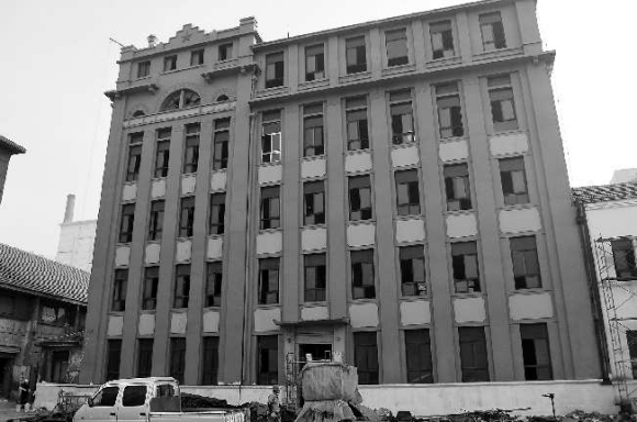 面粉厂现存建筑除生产车间大楼外,还包括电机房、成品仓库、原料仓库等,大楼前的院墙已在年中时拆除。22日,记者从楼前的小广场上看到,一名工人正在大楼南面的成品仓库顶上冲刷尘土,生产车间大楼墙壁上的装修设施还没有完全拆除,整个大楼刚刚粉刷一新,既尊重了建筑原有的色彩风貌,更给人一种高雅、和谐、庄重的美感。