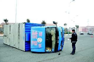 22日下午,烟台市区幸福北路与化工路路口,一辆货车与一辆轿车发生刮擦后侧翻在马路中央,所幸无人员受伤。