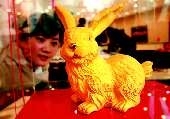 22日,在烟台市区一家金行,一位市民正在观赏憨态可掬的金兔。随着农历兔年临近,款式各异的“黄金兔”摆件纷纷亮相烟台市场。据介绍,这只千足金兔重500.6克,售价在17万9千元左右。本报记者赵金阳 摄影报道