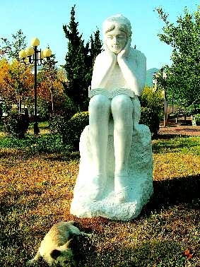作品描述:温暖的阳光下,泛黄的草地上,一只小狗静静地守候在学校新安置的雕塑旁,俨然一副愿与你相伴的神情。