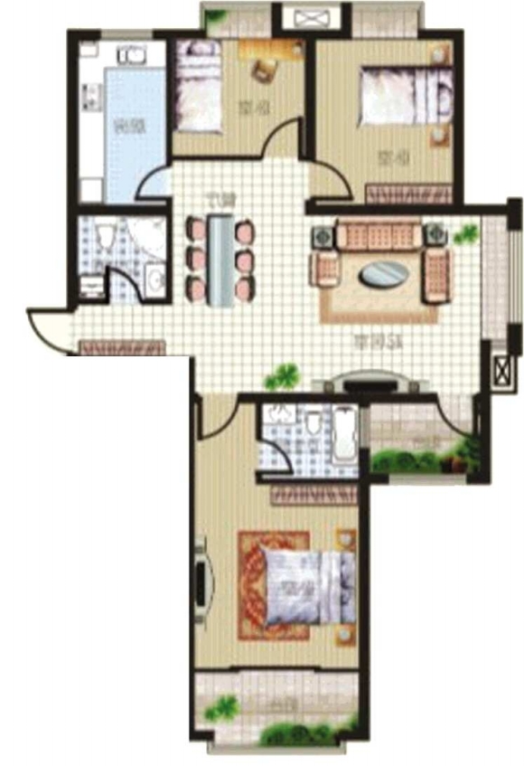 点评:华新新城这个户型设计十分紧凑,房间的实用面积很大,主卧室拥有一个大阳台,为家居生活带来足够阳光和新鲜空气。厨房紧邻餐厅,增加了家居生活的方便性,为了加强卧室之间的联系做了紧密处理。这个户型阳台设计很独特,分散开来,与卧室自成一体。