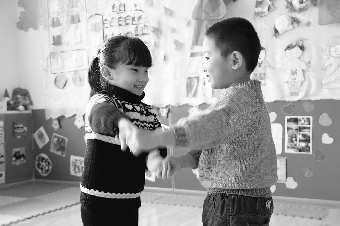 22日,在日照市红豆幼儿园里,两名小朋友在排练舞蹈。据了解,为迎接圣诞节和元旦,幼儿园的每个小朋友都准备了精彩的节目,准备在节日当天表演。本报记者展萍 摄