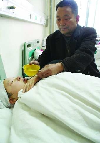 父亲张玉欣正在给躺在病床上的张广秀喂水。