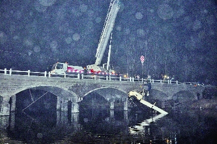 ? 22日晚,金乡县王丕镇金司路莱河桥上,—辆满载蔬菜的货车撞断护栏翻下桥o金乡消防经过近2个小时的救援,将货车打捞上岸,并在河流下游将驾驶员打捞上岸,但驾驶员经过抢救无效死亡o 本报记者 陈鸿儒 通讯员 马常义 摄影报道
