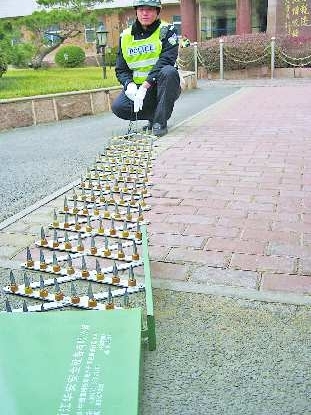 机动队队员展示5米多长的路障破胎器o本报记者 吴金彪 摄