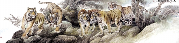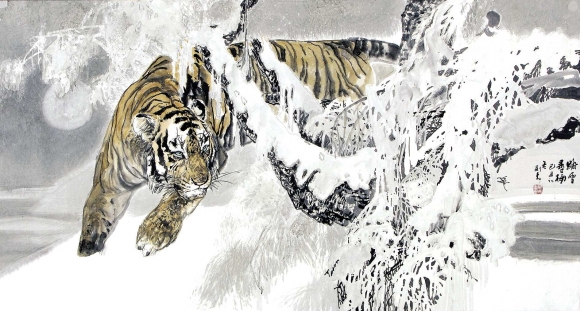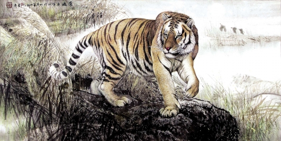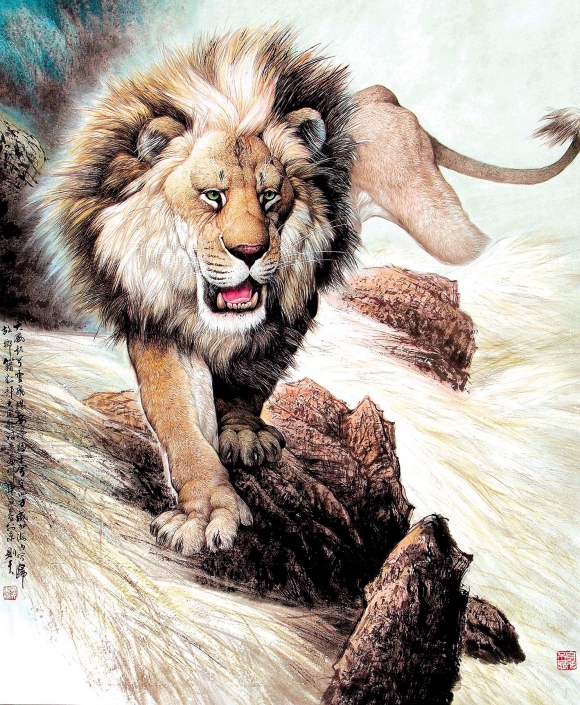 无论是他的写意人物、花鸟,如《一代天骄》、《蒋兆和像》、《闻案图》、《射天狼》等,还是他的工笔狮、虎,如《大风歌》、《天行健》、《雄立图》等,给观者的第一印象即是大气,不同凡响,这一点在画界似乎早已成为共识。何谓大气?胸怀天地之心,包藏宇宙之机者,是为大气之人;究其根源,就是在中国人眼里,大气是“天人合一”的表现,大气之人是得道的高人,而大气的表现则是有德的体现。季则夫作品中的大气,缘自其饱满的创作激情和自身生命的切肤体验。