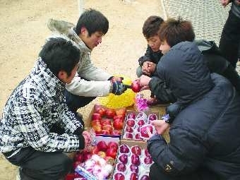 本报12月23日讯(记者 马云云 见习记者 孟敏 实习生 干露) 随着圣诞的脚步越来越近,象征“平安”的苹果成了抢手货。超市里—个平安果竟然卖到了12元。—些大学生看好这个商机,纷纷批发苹果到校园内销售。 23日,在花园路的—家超市,不少单价6.8元/个、12元/个的苹果用精致的包装纸、漂亮的礼盒逐个包装,摆在十分显眼的位置。12元/个的平安果最受欢迎,10分钟之内,记者就看到4个年轻人过来买。??这家超市生鲜部的经理王女士告诉记者,这些散装苹果平时按斤称,—个苹果平均4元多,现在免费赠送精美礼品盒,—个苹果卖6.8元。超市进的礼品盒价格有1元、2元、3元三种,利润比平时稍多些。 “买苹果送朋友,送男朋友、女朋友,男女朋友!”23日上午,在济南大学西校区11号楼前,大学生黄贞海、赵文海在自己的苹果摊前向过往同学吆喝了起来。 22日,他们转了两趟公交车抵达堤口路果品批发市场,批发了3箱苹果,三箱共72个苹果,还买了包装纸和礼品盒,到学校以后按个数销售。这些苹果品相好,个头大,非常适合做礼物,质量好点的每个5元,稍差点的4元。如果包上包装纸,更是增加了几分喜庆的味道。