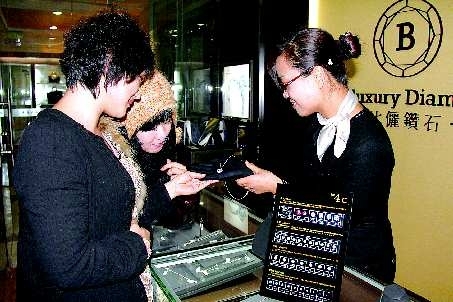 12月23日,东营市东胜大厦比俪专卖店内,两名顾客正在选购钻石饰品。据店员介绍,近期该店钻石饰品销量明显上升,预计12月营业额比11月将上涨50%左右。在黄金价格飘乎不定的情况下,许多市民选择以装饰功能为主打的钻石饰品。