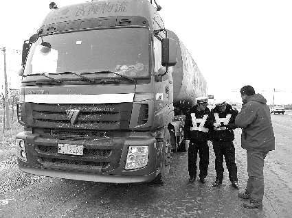 23日上午,河口交警大队民警正在盘查一辆危险品运输车。当天上午突降小雪,东营交警启动应急预案,全市交警上岗,加强对重点路段交通违法行为的查纠力度,特别是危险品运输车辆及公路客运车辆,并提醒广大司机朋友雪天注意减速慢行并保持车距。