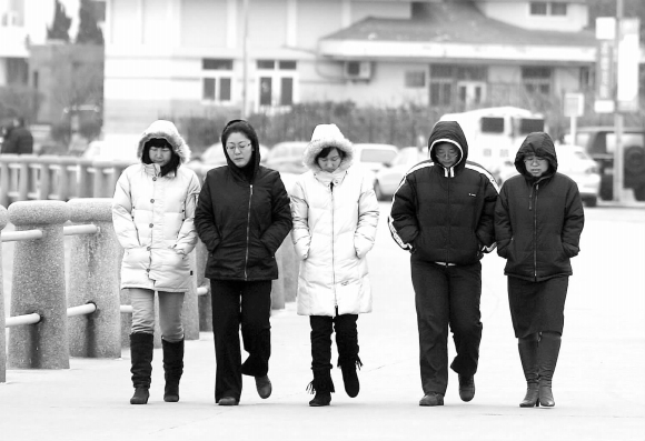 23日,在澳门路上,五名市民穿得严严实实抵御寒冷。记者从青岛气象台获悉,青岛气象台发布大风蓝色预警信号,让外出的市民感觉不太适应。当日岛城气温从3.2℃一路下降到-2.4℃,25日前岛城气温都会持续下降。          本报记者 杨宁 摄