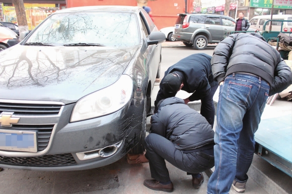 车主牟先生用千斤顶把车顶高,热心路人帮忙往车轮底下垫砖头。本报记者 侯书楠 摄
