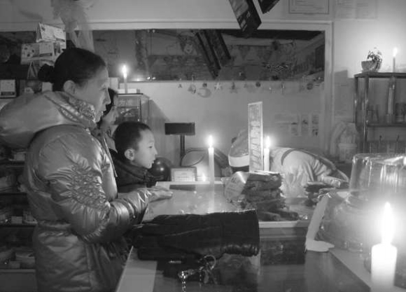 晚上6时左右,记者在柳园路看到,百货大楼往南一片漆黑,路两侧店铺多数关了门,只有女人街附近一家面包店还点着蜡烛经营。金鼎对过一家农村信用社门前,站着几个工作人员,他们介绍,营业厅的防盗门必须用电才能关上,他们只能等着来电后关上防盗门才能离开。