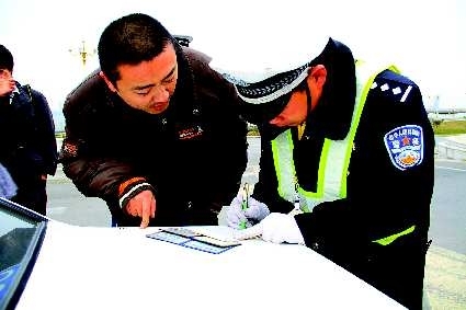 12月23日下午,直属一大队的民警在解放路和滨河西路交会处,对使用假交强险标志的行为进行查纠,仅一小时,就查处了4起使用假交强险标志的违法行为。据临沂市交警支队直属一大队副大队长赵伟介绍,近期有些车主存在使用假交强险标志的现象,近一个月时间共查处了百余起此类违法行为。图为民警对违法使用假交强险标志的车主进行处罚。 记者 徐升 摄