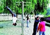 时间:2009年10月;地点:泉城广场;自述:在广场看见不少出行的人游玩的时候还不忘锻炼身体,只有身体好才能玩得好。