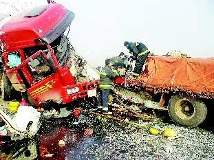 本报12月23日讯(见习记者 李梦娇通讯员尹岩 王海华)12月22日中午,在京台高速公路齐河县境内发生了连环撞车事故,两辆红色的大货车和一辆白色的轻型卡车发生了连环撞。轻型卡车上的被困驾驶员被消防人员及时救出。