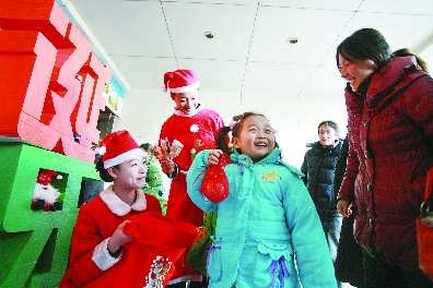 12月24日,在济南长途汽车总站入口处,乘车的小旅客收到了“圣诞老人”送来的平安果和棒棒糖。圣诞节前夕,总站工作人员扮成圣诞老人,向幸运旅客派发礼物,让出行旅客尤其是孩子们享受到更多圣诞的欢乐。 本报记者 王媛 摄