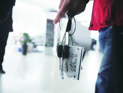 29日,一名汽车销售员正拿着车钥匙为顾客。受小排量车购置税上调影响,许多消费者在年底突击买车。虽然不少经销商减少甚至取消了优惠促销,但多个品牌汽车销量比前两个月增加了50%以上。