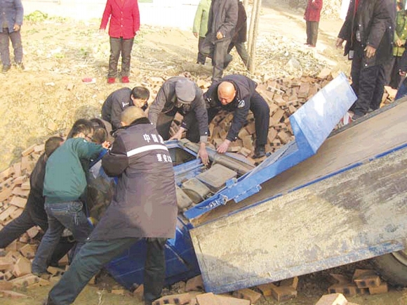 12月28日上午10时许,宁阳县一辆拉砖的农用三轮车不慎翻到沟底,司机被压在驾驶室里动弹不得。接到求救后,民警迅速赶到现场,将司机救出。