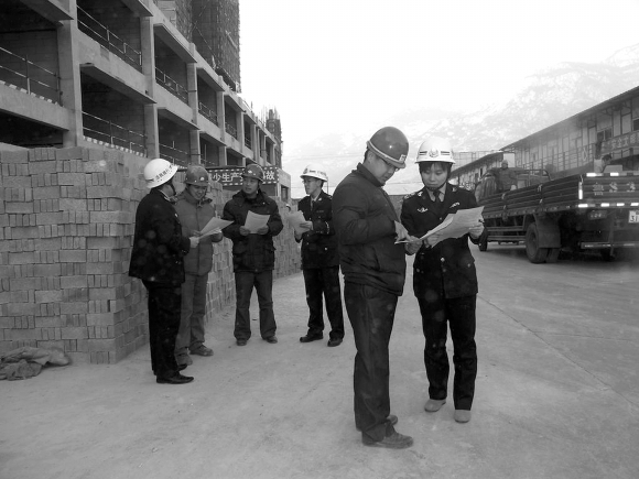29日,泰安市城市管理行政执法局直属执法大队的工作人员,在长城路附近一家工地向工地负责人和工人宣传建筑法律法规。