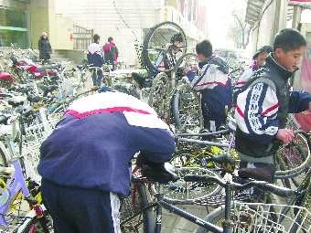 29日中午12时许,解放大道上的电信公司公交站牌附近,德州市第五中学的学生们放学后,竟发现自己的自行车不知被谁摞成了两米高。记者路过后,亲自动手帮学生们将相互交叉在一起的自行车理出了“头绪”。本报记者 董传同 杨金涛 摄影报道