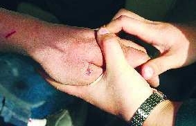 在急救车上握着病人的手,给病人温暖和鼓励。
