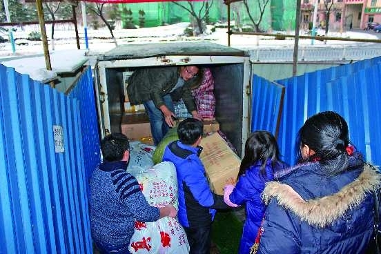 29日下午,本报记者将市民捐赠给温拖乡小学的衣物打包,抬到邮局的快递车辆上,这批衣物将于最近两天寄往温拖乡。这些衣物有1200多斤,装了50个大袋子和纸箱。 本报记者 侯书楠 摄