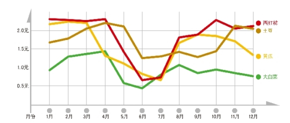 本报12月30日讯(记者 马云云 实习生 干露 郑晓彤) 2010年即将画上句号。本报整理了济南市物价局对市内十个区县主要农副产品价格的统计数据,并从中选取了市民常吃的大白菜、黄瓜、西红柿、土豆等四种菜品,梳理了它们在每个月25日的价格情况,并做成曲线图,以大致反映本年度的蔬菜价格走势情况。 根据曲线图显示,本年度,四类菜品的最低价格均出现在6月份,最高价格分别出现在1月、2月和4月份。匡山农产品批发市场副总经理刘福水分析说,这大致与济南每年的蔬菜价格走势规律相一致。 刘福水说,每年的初夏都是本地大路菜大量上市的时候,以西红柿、黄瓜为代表的大批蔬菜价格下降。而到了春节前后,大部分本地菜来源于本地大棚和南方,由于成本高、产量低,价格自然有所抬高。 总体来看,今年蔬菜价格较去年稍高。在这四种菜品中,今年大白菜的均价为0.93元,比去年高0.3元,西红柿为1.88元,比去年高0.31元,土豆为1.88元,则比去年高出0.63元,只有黄瓜比去年便宜,但只便宜了0.01元。业内人士分析,这与物价总体上涨有关。 今年,与蔬菜种植和运输有关的物资价格都有上涨,菜价出现一定涨幅在所难免。此外,今年全国各地多次出现恶劣天气,这也在一定程度上影响了蔬菜生长,成为推动涨价的因素之一。刘福水认为,尽管价格偏高,但今年菜价依然在正常范围之内。 此外,与往年比,今年有几个特殊情况。“姜你军”、“蒜你狠”风波波及济南,10月份以前,大蒜和生姜价格达到历史最高水平,但近期均出现大幅回落。