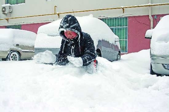 30日,威海一小区内一个小孩在厚厚的积雪中玩耍。本报记者 冯砚农 摄