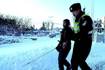 30日早上,莱山区鹿鸣小区对面,交警四大队副大队长杨涛带着一位盲人在雪中行走。30日一场暴雪覆盖了市区大街小巷,供盲人行走的盲道被大雪覆盖,一位盲人在参加盲人按摩培训时因找不到盲道而迷失了方向。本报记者 张琪 本报通讯员姜波 摄影报道