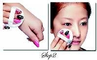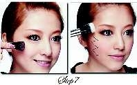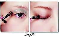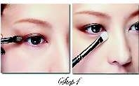 步骤分析:用深一色号的眼影加长眼尾部分,制造小烟熏效果,令双眼更深邃;利用银色眼影打亮眼头部位,凸显眼睛轮廓,同时制造楚楚动人感,双眼看上去水汪汪的!
