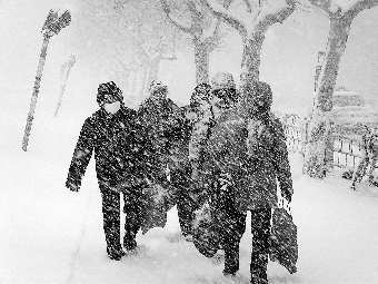 30日,威海袭来暴雪。由于人行道上积雪有点厚,在新威路振华商场外,几位刚买完东西的行人排着队,一个接一个地沿着前面人的脚印走路。 本报记者 林丹丹 摄