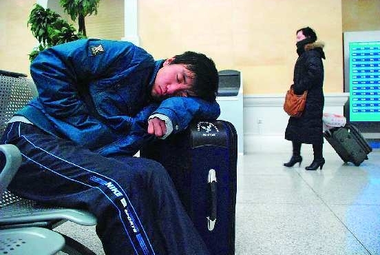 12月30日,在青岛市火车站地下候车室,准备返乡回太原的王海瑞枕着行李箱睡着了。春节将至,青岛火车站近来有大批农民工返乡,因为工厂停工、裁员和工程结束等原因,无法找到新工作的他们不得不提前返乡过春节或另谋出路。据小王介绍,在青岛工作不到半年没有合适的工作岗位,等到了年末肯定返乡的人流量比较大,不好买票回家,索性提前回家过节。 本报记者 张晓鹏 摄影报道