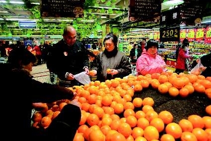 30日下午,在市区一家大型超市水果专区,很多顾客在抢购价格为5元/公斤的脐橙。据工作人员介绍,本周水果价格较上周基本持平,因为元旦临近,市民都会购买过节的果品,所以近期这里的水果交易量有所上升。记者廖杰 摄