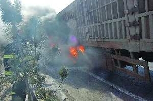 12月30日10时15分,在335省道莒县龙山镇驻地附近一货车轮胎起火,莒县公安消防大队接警后,迅速赶往现场,10分钟后将火扑灭。据货车司机介绍,他是在刹车后才发现右后侧轮胎起火的,起火原因可能是给轮胎降温的水管冻住或是水箱没水了。 见习记者 徐艳 通讯员 蔡令玉 摄影报道 (请提供线索的张先生领取50元)