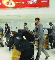 2010年12月31日,中国国家队队员周海滨(前)和队友抵达多哈。当日,中国国家足球队抵达卡塔尔,将参加2011 年1月7日至29日在卡塔尔多哈进行的亚洲杯足球赛。