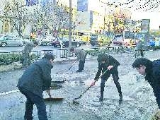 本报96706热线消息(记者 殷亚楠 通讯员 张昊宇) 新年第一天,大部分人在享受假期的悠闲,可历下城管的50多名环卫工作人员却忙坏了,他们从清晨5点就投入了“战斗”,消除了一大交通隐患。 当天凌晨,由于污水外溢,泺源大街与双福街路口处出现了一条二百多米长的冰带,一直向东延伸到朝山街南口,冰层最厚的地方近20厘米。历下区城管局局长朱俊如带领工作人员奋力除冰,而且临时抽调了千佛山、大明湖环卫所的环卫工人前来支援,局机关的节日值班人员也全部投入了除冰工作,共计50多人。4个小时后终于把路面清理干净。
