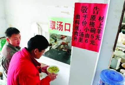 2010年12月,菏泽一家羊汤馆里贴着一张涨价告示。2010年哪个汉字使用率最高,几乎非“涨”字莫属。“蒜你狠”、“姜你军”、“苹什么”、“豆你玩”……2010年,由于生活必需品相继涨价,网络上调侃物价上涨的热词层出不穷,在一定程度上反映了物价上涨令人心忧。 本报记者 邱志强 摄