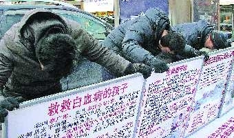 2010年1月12日,气温-4℃,李广军等4名汉子为了给各自患白血病的孩子筹集救命钱,组团从东北经过十多个大城市后来到济南沿街乞求救助,他们用慈父的大爱绘就一幅“乞救路线图"。面对慷慨解囊的济南市民,他们深深地鞠躬:“谢谢济南好心人!” 本报记者 周青先 摄
