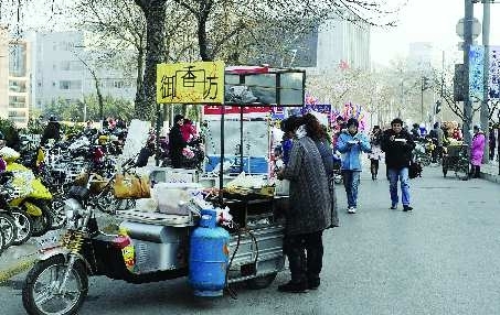 上 既妨碍了交通又影响了市容 本报记者 王媛 摄 2日泉城广场南侧数十个小吃摊横在非机动车道