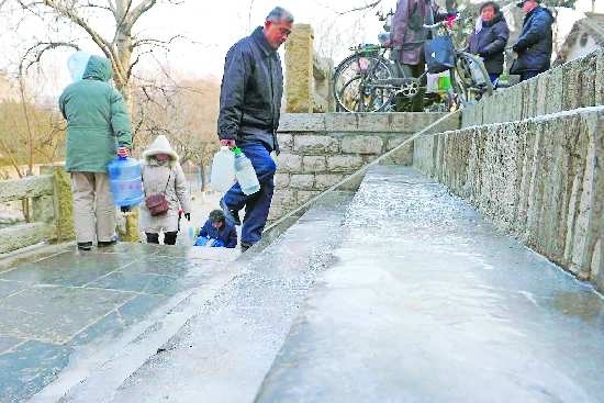 3日,黑虎泉边的台阶上结了厚厚的一层冰,给过往行人带来不便。近期天气寒冷,前往泉边打水的市民要多加留意,小心路滑。 本报记者 邱志强 摄