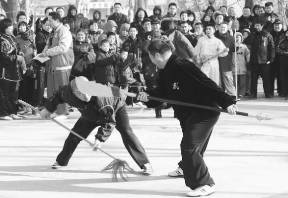 1月1日上午,在聊城人民公园,东昌府区传统武术协会举行庆元旦武术汇演活动,来自全区近百名市民表演各种武术套路。图为张怀军、刘喜云表演少林大刀进枪。