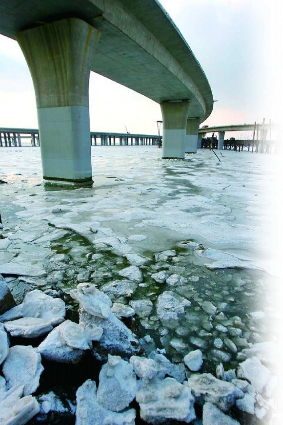 1月3日下午,在胶州湾环湾大道,记者看到海湾沿线泛白的海冰从岸边一直延伸至海面约有上百米,在四方滨海新城、海湾大桥接线端附近的岸边堆积着大块的海冰,每块厚度接近10厘米。而在海湾大桥接线端,大桥近岸的桥柱周围全部被海冰封住(如图),上面还覆盖着一层清雪。 国家海洋局北海预报中心1月3日发布的海洋环境预报显示,3日,莱州湾浮冰外缘线4海里;黄海北部和胶州湾被云覆盖。其中,胶州湾未来3天海冰最大外缘线达1海里左右,一般冰厚2—4厘米,最大厚度将达到7厘米。