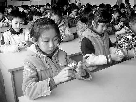 为锻炼孩子们的空间想象能力,并丰富充实孩子们的校园生活,近日,威海市统一路小学三年级的部分孩子举行了别开生面的魔方比赛,仅一分钟就有二十多名学生将魔方还原成功。 本报记者 侯书楠 通讯员 戚巧玉 唐春晖 摄影报道