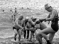 1日早晨8时,威海“双举海参杯”环翠冬泳日活动在幸福公园亲水区举行,170多人下海,其中,年龄最大的81岁,女性30人。大家以此形式庆祝2011年的开始。当时,气温-5℃,水温仅0.5℃,岸边积雪凝冰,还有一米高的海浪。 本报记者 高洪超 摄影报道