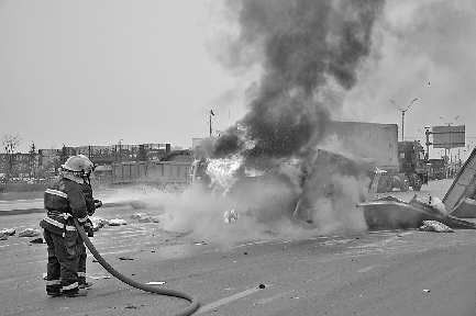 本报济宁1月3日热线消息(记者 陈鸿儒 通讯员 马常义) 1月1日下午,金乡县105国道收费站附近发生一起交通事故,两车追尾后,其中一辆小货车侧翻,车头起火。金乡消防接警后迅速赶至事发现场,发现车内两人已逃生,经过5分钟的努力,火灾被成功扑灭。 1月1日15时06分,金乡消防大队接到报警,该县105国道收费站北侧发生一起交通事故,一辆满载袋装洗衣粉的小货车在十字路口准备拐弯时,一辆大货车从后方与其发生追尾,直接将小货车撞翻。事故发生后,小货车上两人从破碎的挡风玻璃处逃生,其中一人头部受轻伤,他们立即拨打了120、122求助。 在等待中,侧翻的小货车车头突然开始冒烟、着火,见此情况,车上的两人着了慌,赶忙拨打119报警,金乡消防大队接警后,立即出动一部消防水罐车和7名官兵赶赴事故现场进行扑救。 由于事故地点距离消防驻地很近,消防官兵迅速赶到了现场,发现货车上的洗衣粉撒得到处都是,小货车车头正在猛烈燃烧,车底还蹿出火苗,燃烧造成了大量浓烟,现场弥漫着一股强烈的烧焦味。经过了解,车内无其他人员被困,消防官兵立即使用高压水枪进行灭火,仅用了5分钟就将大火扑灭。 据小货车驾驶员介绍,当时这个十字路口的交通灯不亮,他行驶至十字路口处准备转弯,突然后方一辆大货车与他发生碰撞,将他的车辆撞翻。他和同车的朋友一起从破碎的挡风玻璃处逃生,没过一会儿,货车突然冒烟着火,他立刻打119报警,所幸并未造成严重的人员伤亡。
