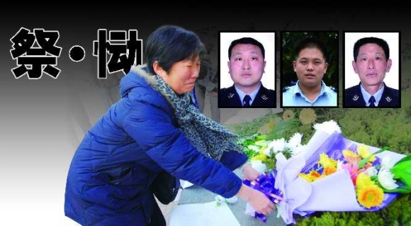 5日,泰安居民王艳丽来到“1·04”持枪杀人案现场,悼念牺牲的2位民警和1名协勤人员。当天,大批泰安市民自发前往悼念。 本报记者 刘丽 摄